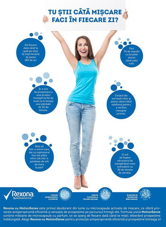 Prin urmare, vara aliatul ideal este Rexona cu MotionSense: prospețime la fiecare mișcare! Milioane de microcapsule se activează de fiecare data când te miști, pentru ca tu să te bucuri de o senzație de prospețime îndelungată! Puteți sta la curent cu noutăți de la Rexona pe pagina de Facebook: https://www.facebook.com/RexonaRomania
